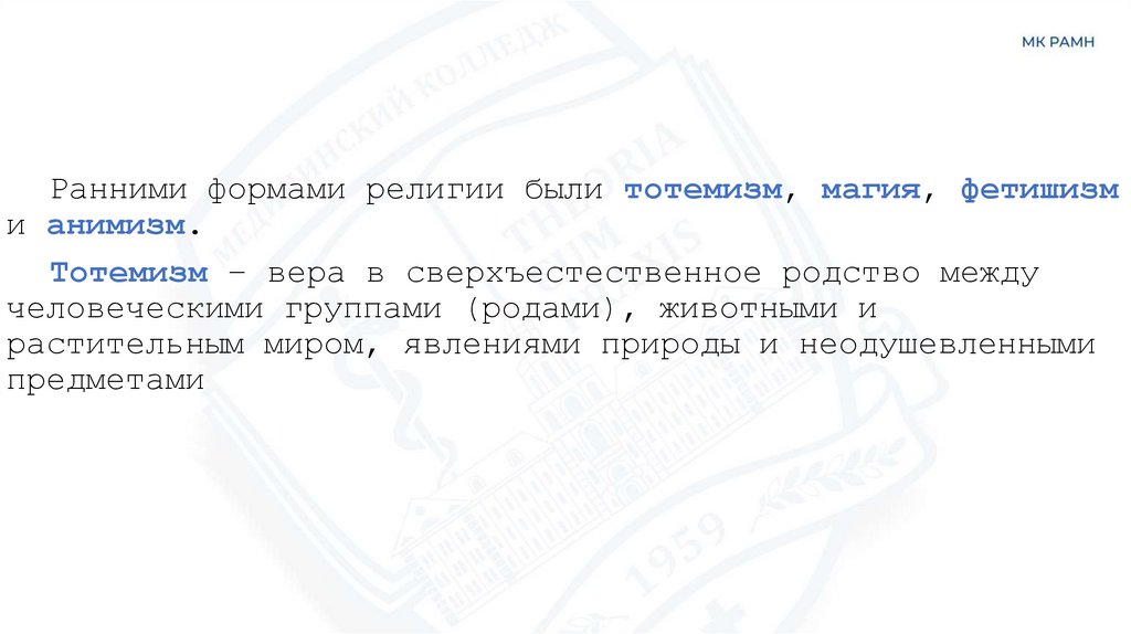 Ранними формами религии были тотемизм, магия, фетишизми анимизм.