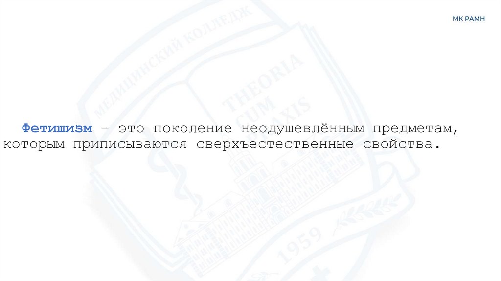 Фетишизм – это поколение неодушевлённым предметам,которым приписываются сверхъестественные свойства.