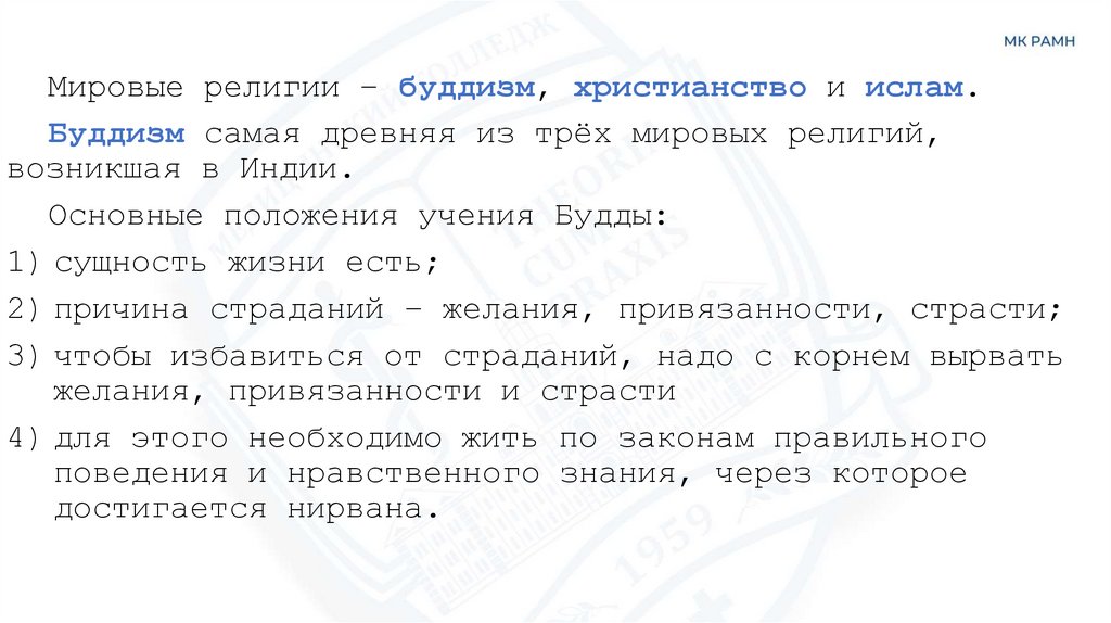 Мировые религии – буддизм, христианство и ислам.Буддизм самая древняя из трёх мировых религий,