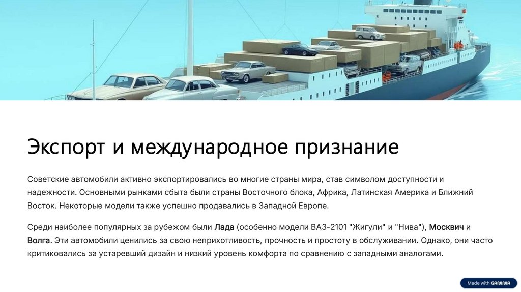Экспорт и международное признаниеСоветские автомобили активно экспортировались во многие страны мира, став символом доступности и