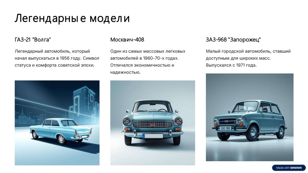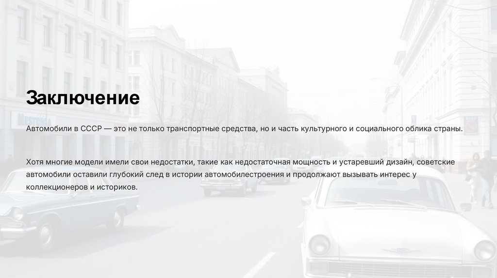 ЗаключениеАвтомобили в СССР — это не только транспортные средства, но и часть культурного и социального облика страны.