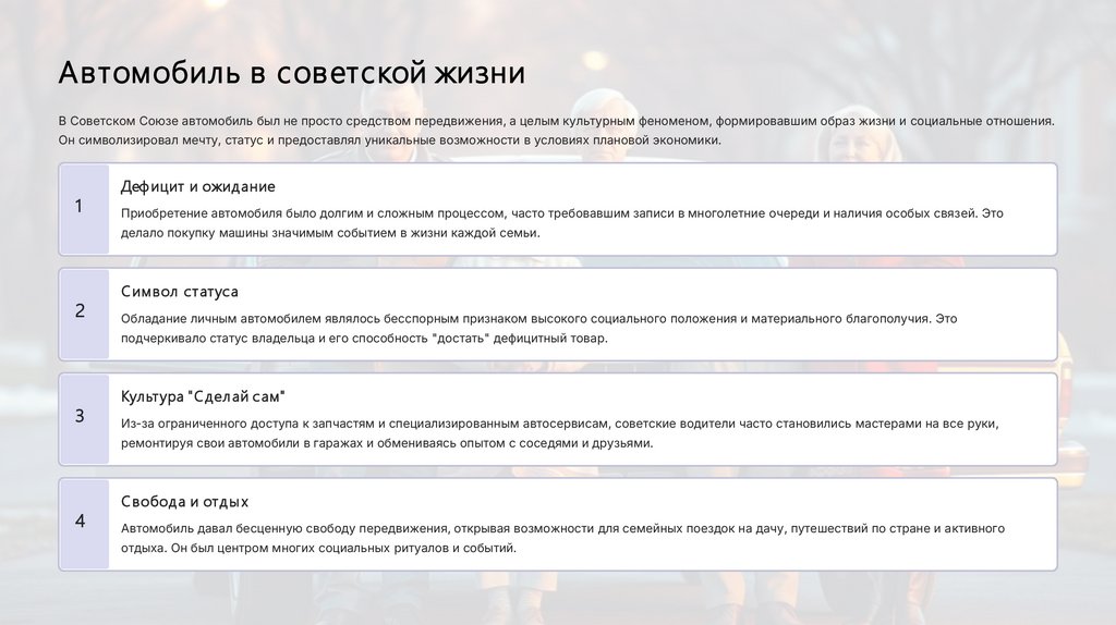 Автомобиль в советской жизниВ Советском Союзе автомобиль был не просто средством передвижения, а целым культурным феноменом, формировавшим образ жизни и социальные отношения.