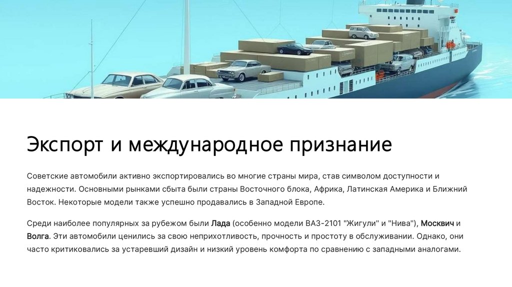 Экспорт и международное признаниеСоветские автомобили активно экспортировались во многие страны мира, став символом доступности и