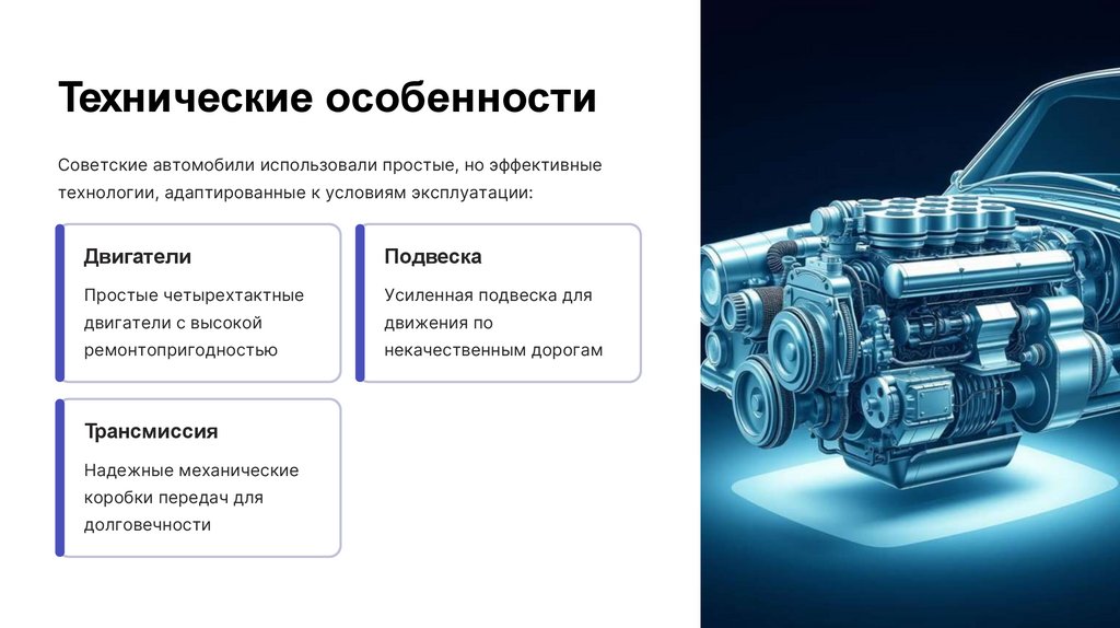 Технические особенностиСоветские автомобили использовали простые, но эффективные