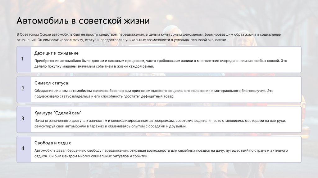 Автомобиль в советской жизниВ Советском Союзе автомобиль был не просто средством передвижения, а целым культурным феноменом, формировавшим образ жизни и социальные