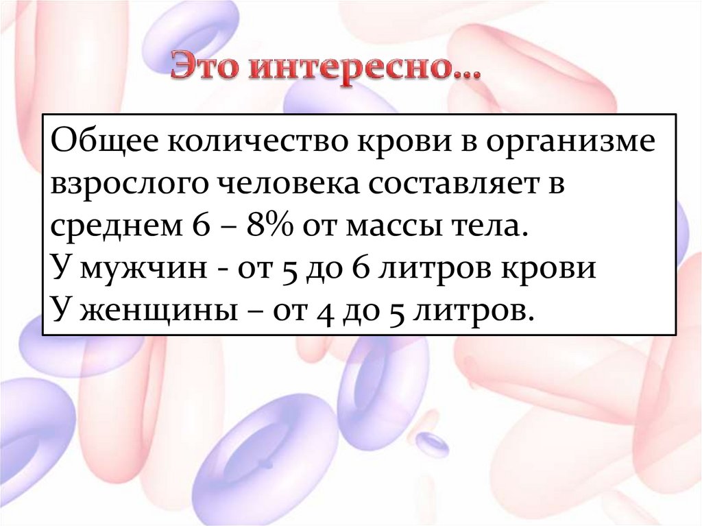 Общее количество крови в организмевзрослого человека составляет в