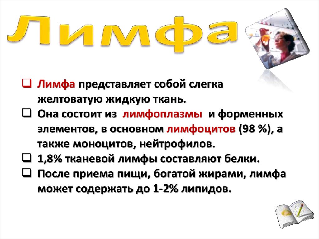 Лимфа представляет собой слегкажелтоватую жидкую ткань.