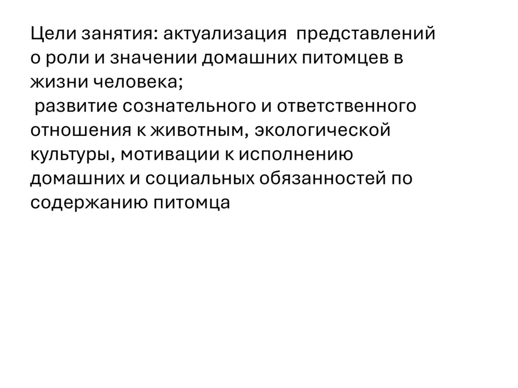 Цели занятия: актуализация представленийо роли и значении домашних питомцев в