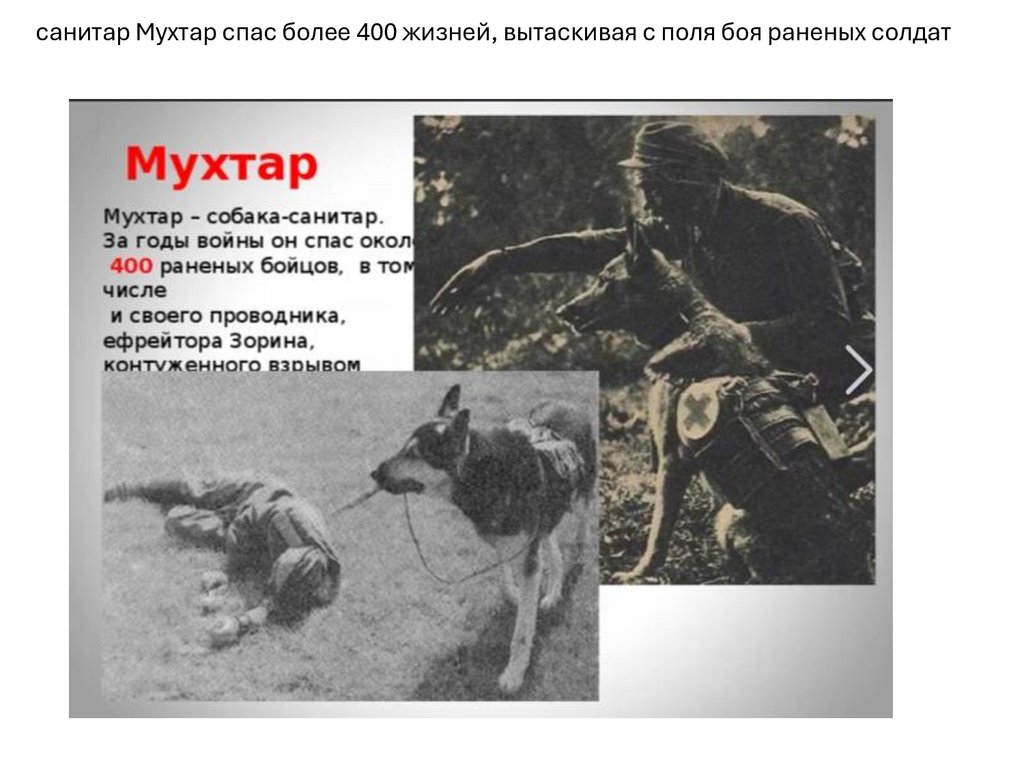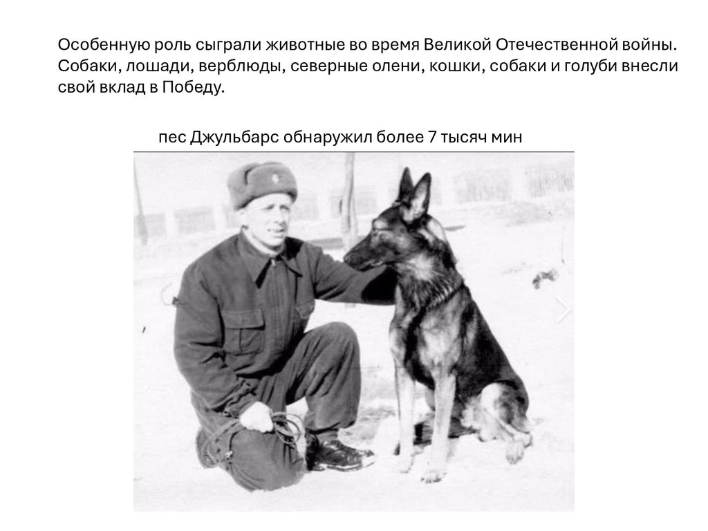 Особенную роль сыграли животные во время Великой Отечественной войны.Собаки, лошади, верблюды, северные олени, кошки, собаки и голуби внесли