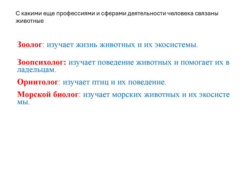 С какими еще профессиями и сферами деятельности человека связаныживотные