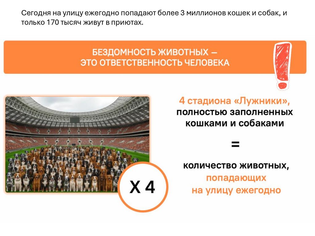 Сегодня на улицу ежегодно попадают более 3 миллионов кошек и собак, итолько 170 тысяч живут в приютах.