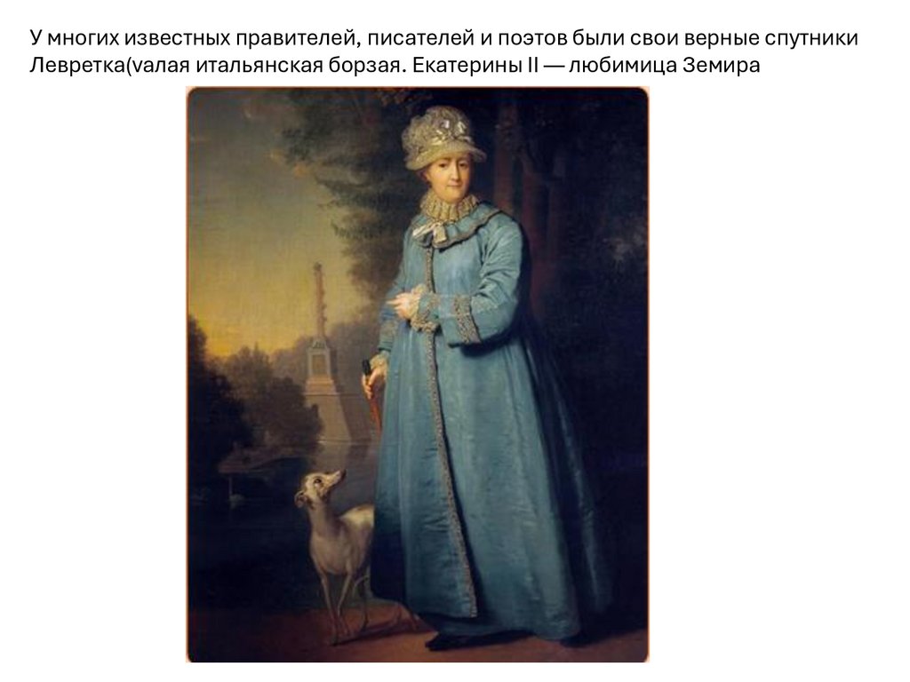У многих известных правителей, писателей и поэтов были свои верные спутникиЛевретка(vалая итальянская борзая. Екатерины II — любимица Земира