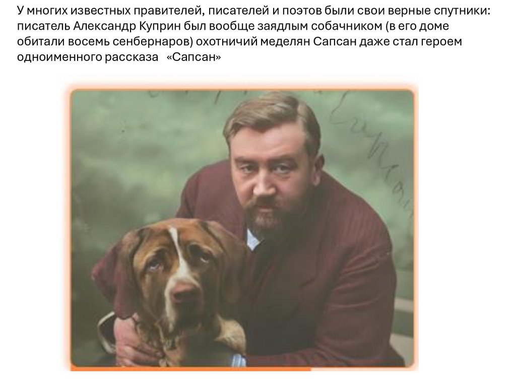 У многих известных правителей, писателей и поэтов были свои верные спутники:писатель Александр Куприн был вообще заядлым собачником (в его доме