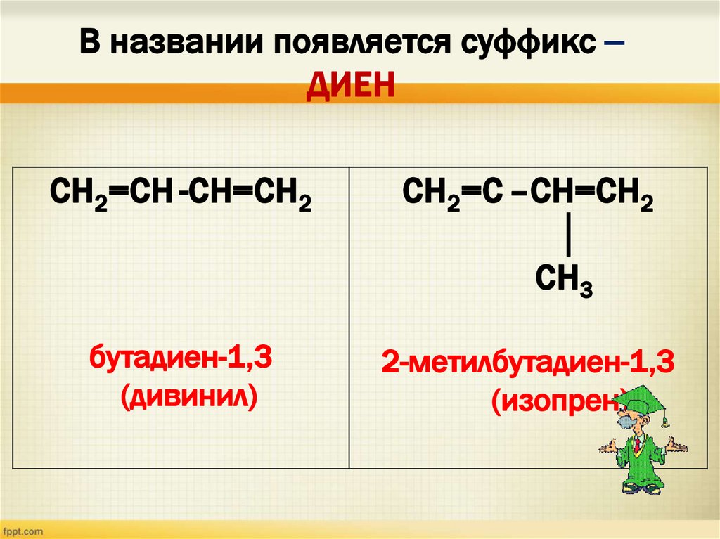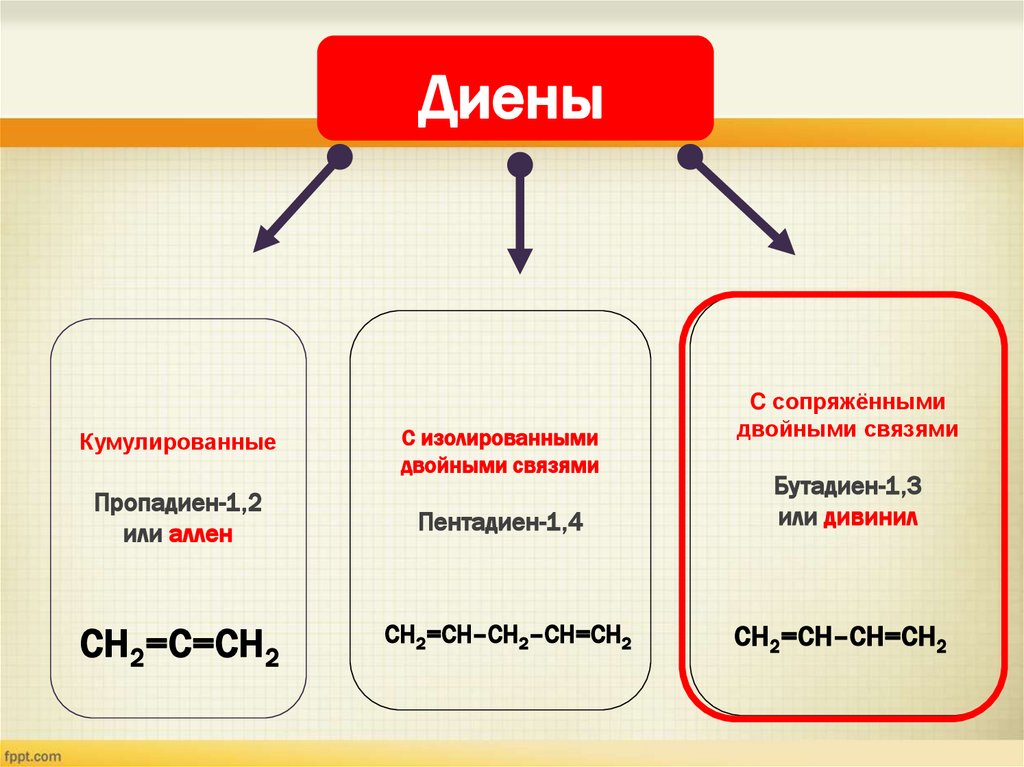 Пример: СН3 – СН = СН – СН = СН2Другие названия: сопряжённые диены, 1, 3-диены.