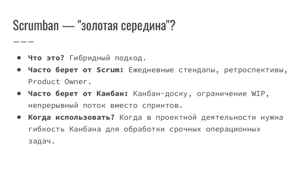 Scrumban — "золотая середина"?● Что это? Гибридный подход.