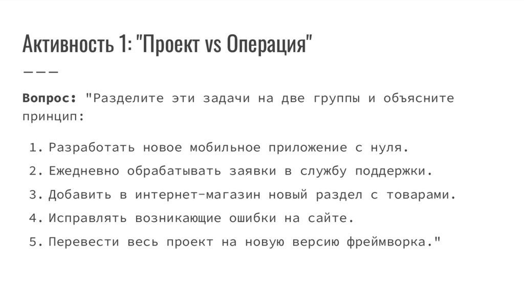 Активность 1: "Проект vs Операция"Вопрос: "Разделите эти задачи на две группы и объясните