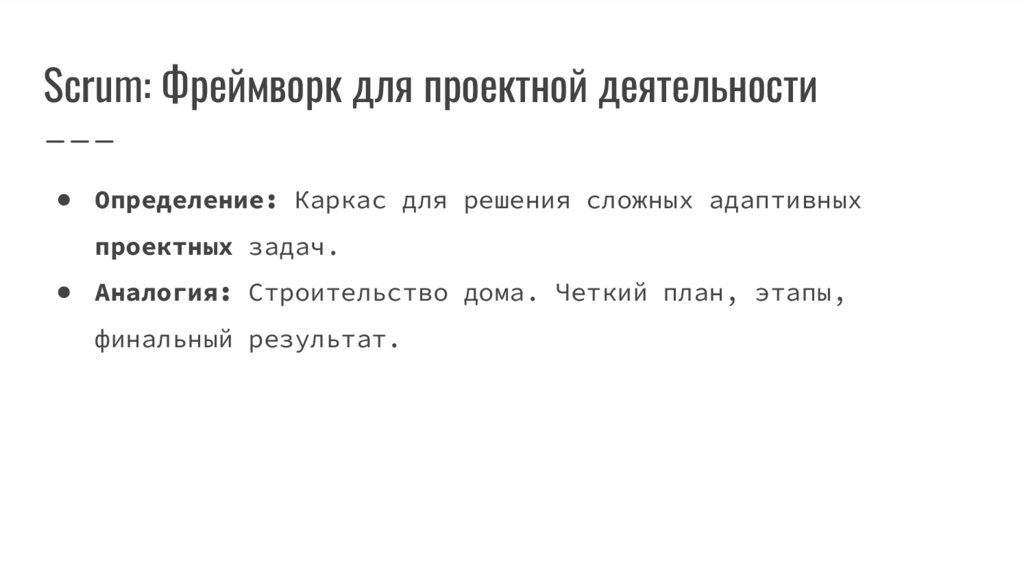 Scrum: Фреймворк для проектной деятельности● Определение: Каркас для решения сложных адаптивных