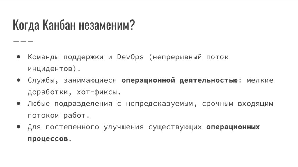 Когда Канбан незаменим?● Команды поддержки и DevOps (непрерывный поток