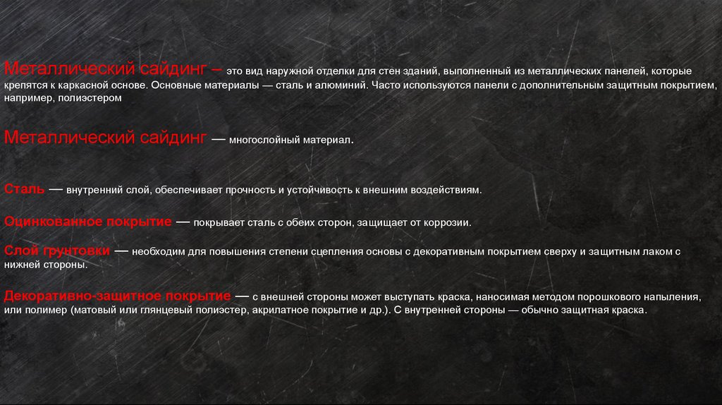 Металлический сайдинг – это вид наружной отделки для стен зданий, выполненный из металлических панелей, которыекрепятся к каркасной основе. Основные материалы — сталь и алюминий. Часто используются панели с дополнительным защитным покрытием,