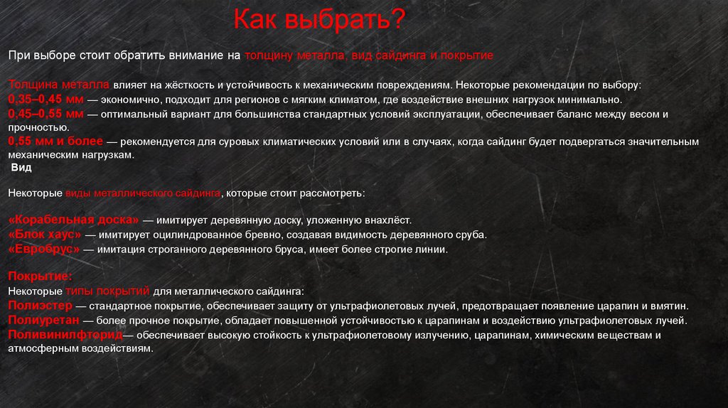 Как выбрать?При выборе стоит обратить внимание на толщину металла, вид сайдинга и покрытие