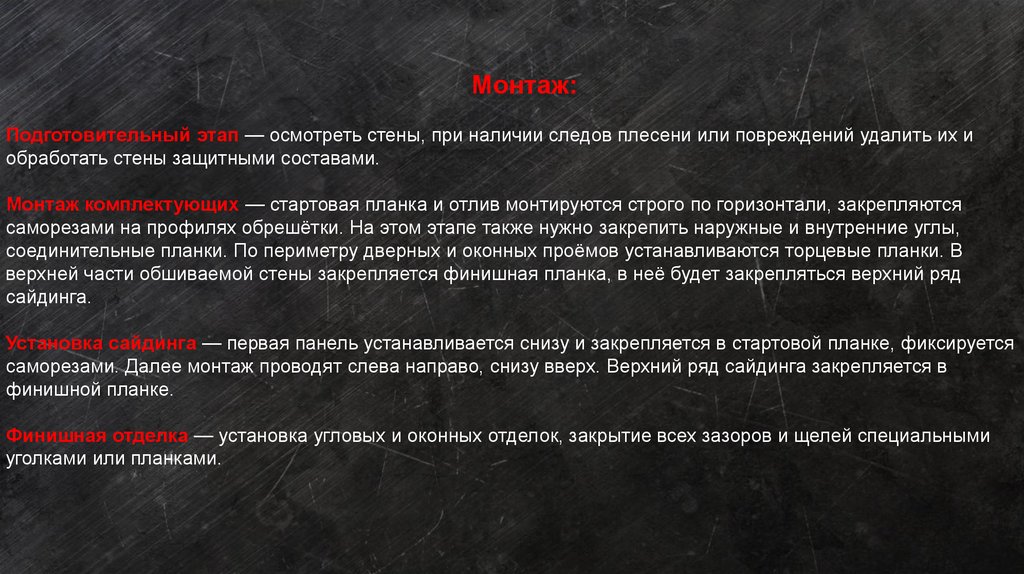 саморезами. Далее монтаж проводят слева направо, снизу вверх. Верхний ряд сайдинга закрепляется в