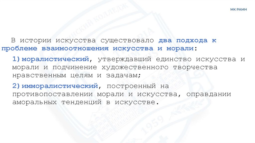 В истории искусства существовало два подхода кпроблеме взаимоотношения искусства и морали: