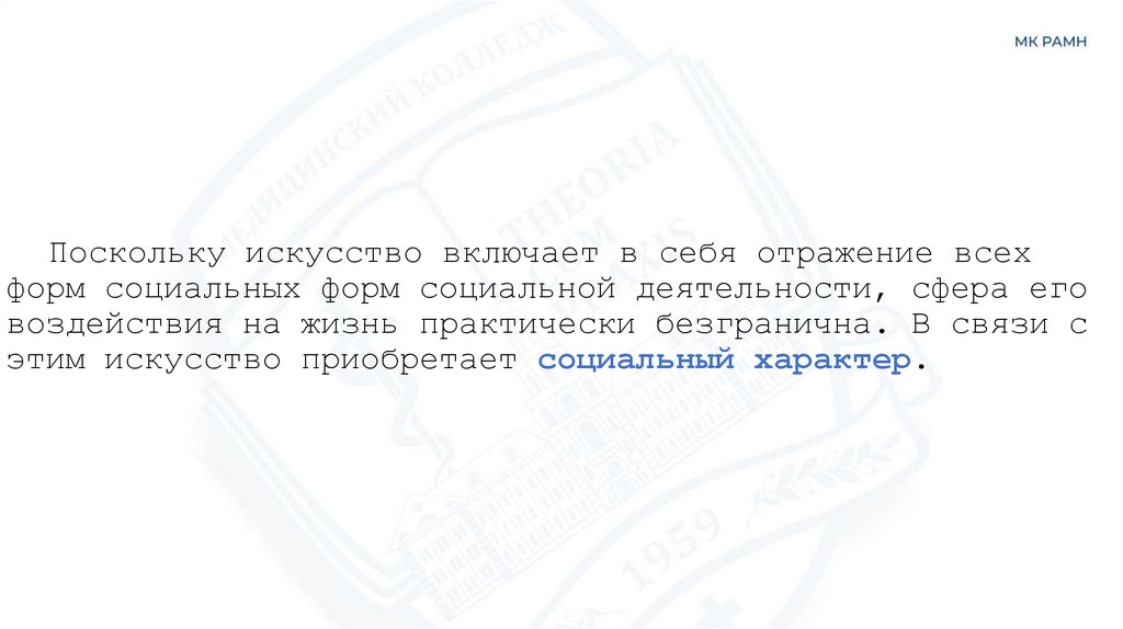 Поскольку искусство включает в себя отражение всехформ социальных форм социальной деятельности, сфера его