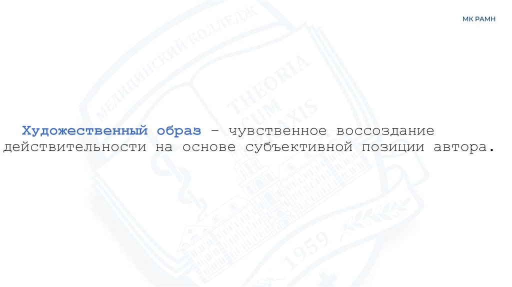 Художественный образ – чувственное воссозданиедействительности на основе субъективной позиции автора.
