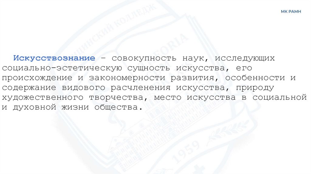 Искусствознание – совокупность наук, исследующихсоциально-эстетическую сущность искусства, его