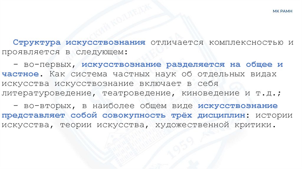Структура искусствознания отличается комплексностью ипроявляется в следующем: