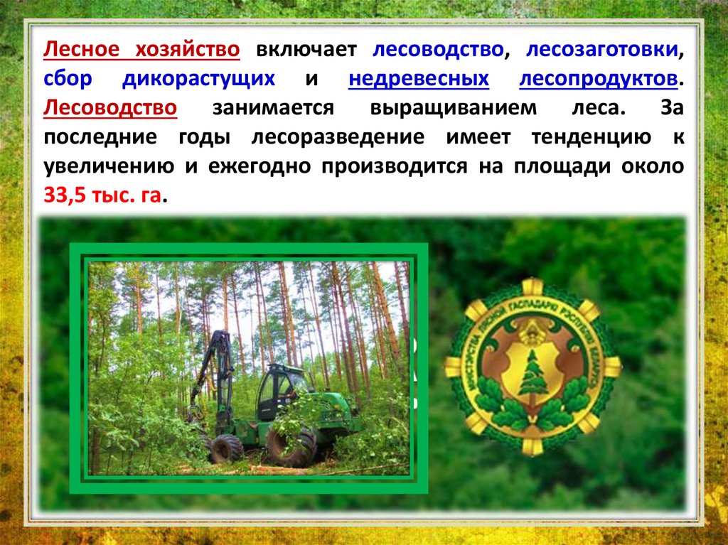 Лесное хозяйство включает лесоводство, лесозаготовки,сбор дикорастущих и недревесных лесопродуктов.