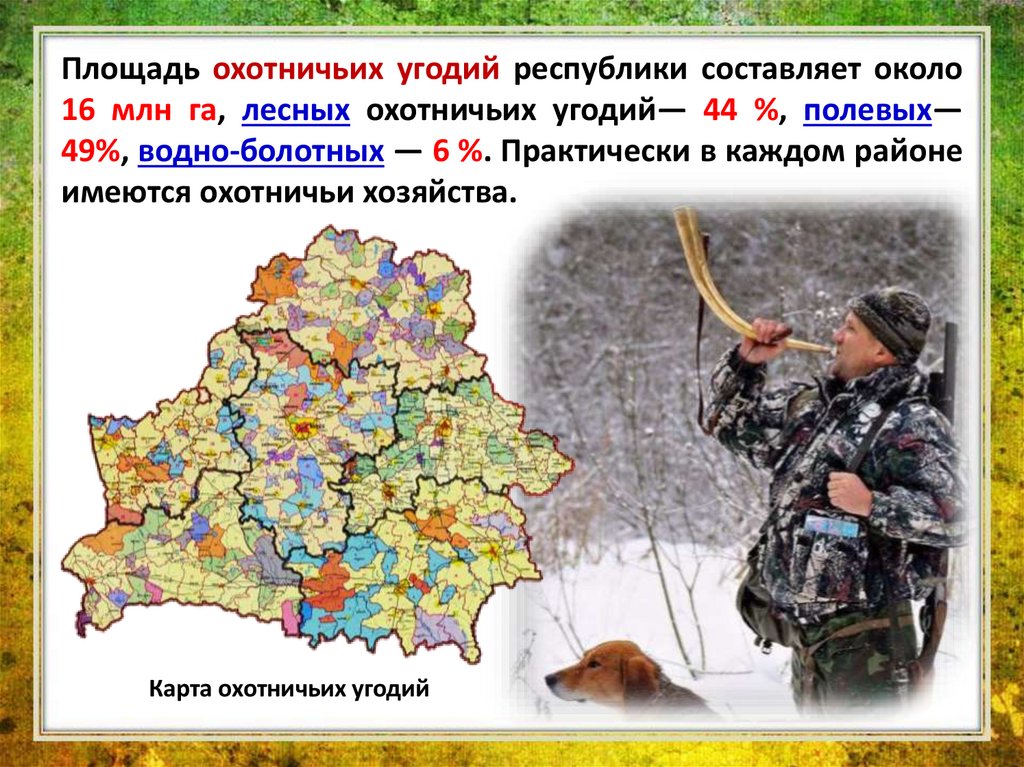 Площадь охотничьих угодий республики составляет около16 млн га, лесных охотничьих угодий— 44 %, полевых—