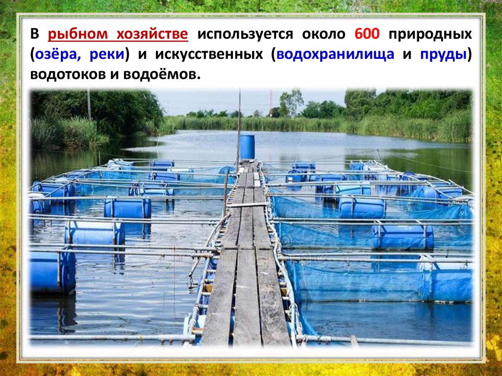В рыбном хозяйстве используется около 600 природных(озёра, реки) и искусственных (водохранилища и пруды)