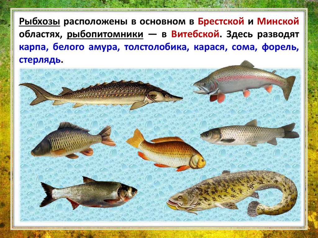 Рыбхозы расположены в основном в Брестской и Минскойобластях, рыбопитомники — в Витебской. Здесь разводят