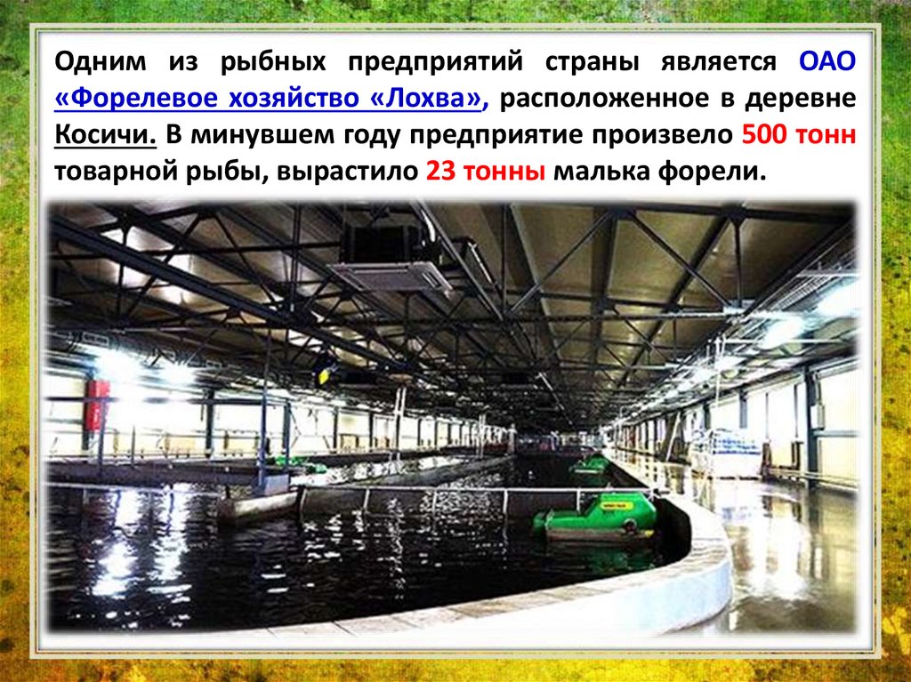 Одним из рыбных предприятий страны является ОАО«Форелевое хозяйство «Лохва», расположенное в деревне