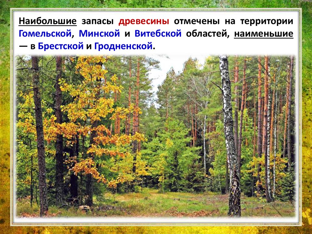 Наибольшие запасы древесины отмечены на территорииГомельской, Минской и Витебской областей, наименьшие