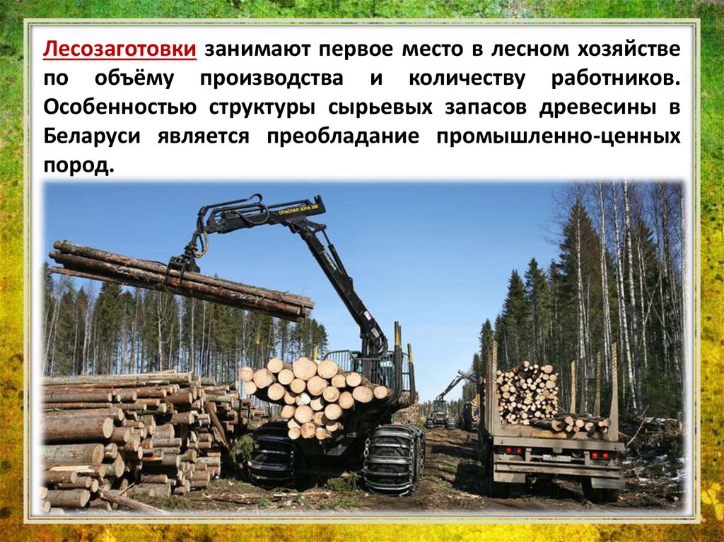 Лесозаготовки занимают первое место в лесном хозяйствепо объёму производства и количеству работников.