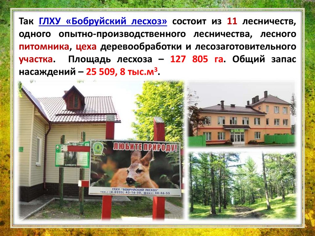 Так ГЛХУ «Бобруйский лесхоз» состоит из 11 лесничеств,одного опытно-производственного лесничества, лесного