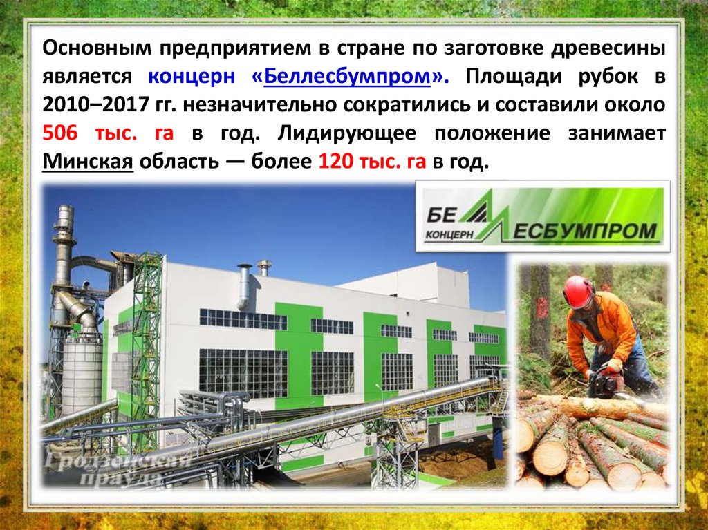 Основным предприятием в стране по заготовке древесиныявляется концерн «Беллесбумпром». Площади рубок в