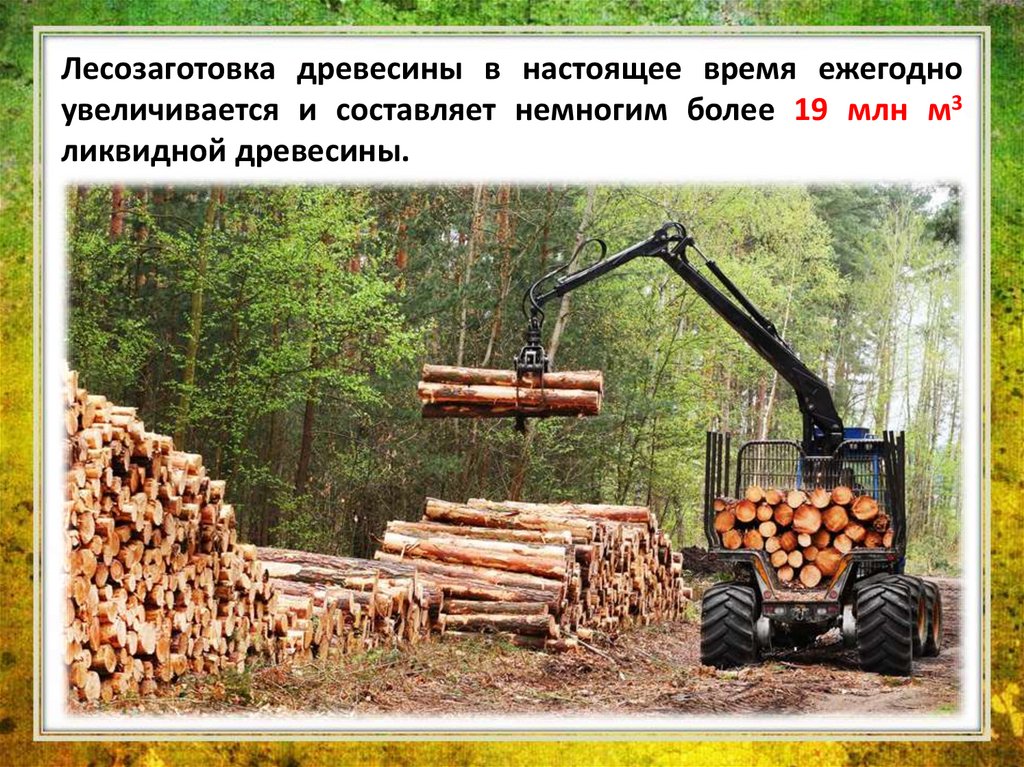 Лесозаготовка древесины в настоящее время ежегодноувеличивается и составляет немногим более 19 млн м3