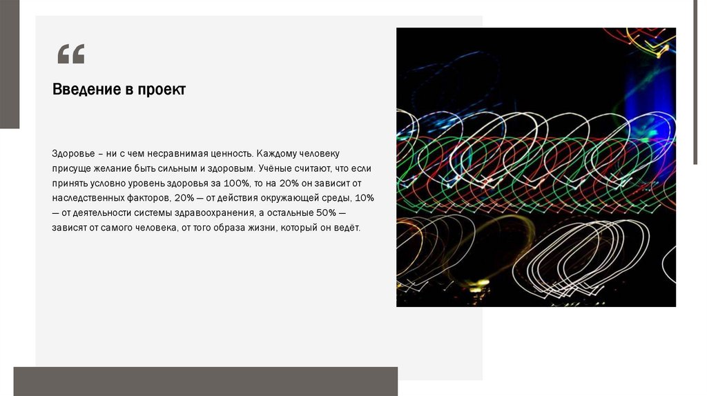 Введение в проектЗдоровье – ни с чем несравнимая ценность. Каждому человеку