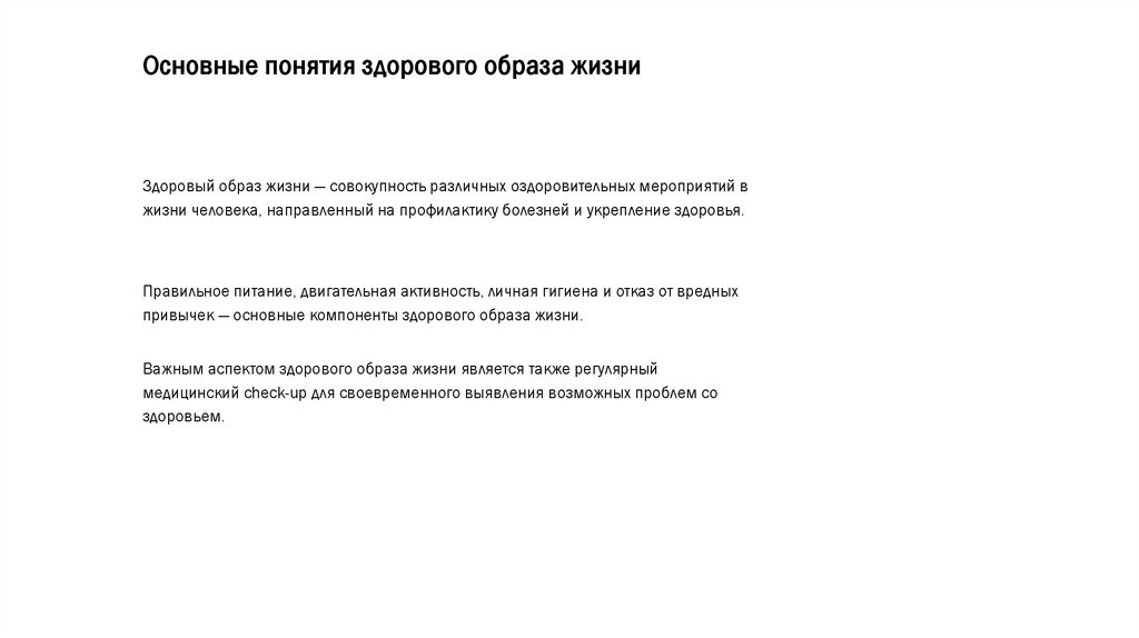 Основные понятия здорового образа жизниЗдоровый образ жизни — совокупность различных оздоровительных мероприятий в