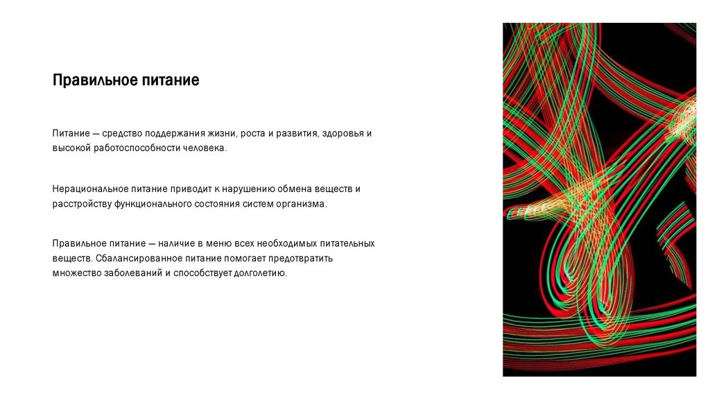 Правильное питаниеПитание — средство поддержания жизни, роста и развития, здоровья и