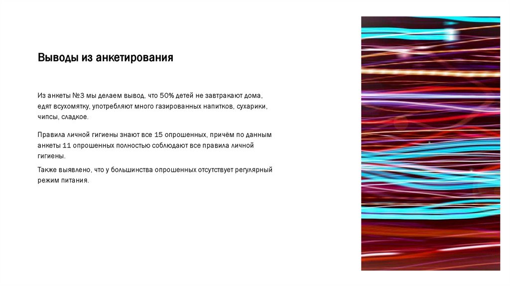 Выводы из анкетированияИз анкеты №3 мы делаем вывод, что 50% детей не завтракают дома,