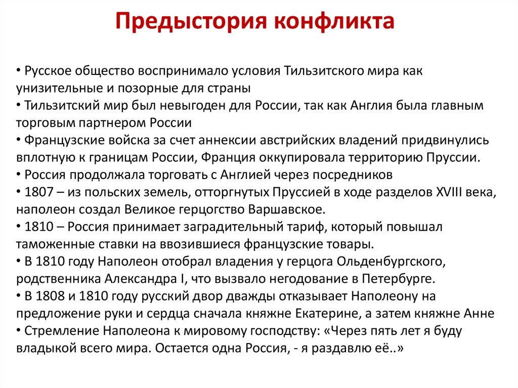 Предыстория конфликта• Русское общество воспринимало условия Тильзитского мира как