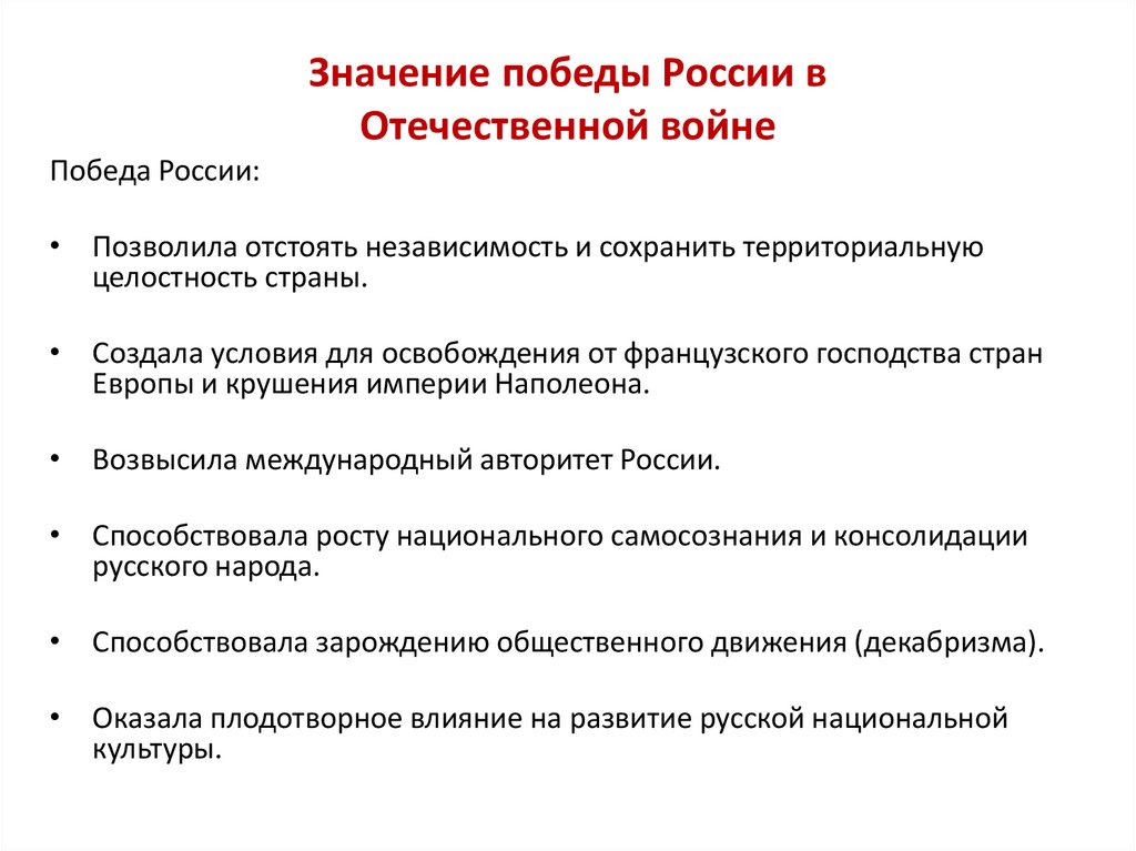 Значение победы России вОтечественной войне