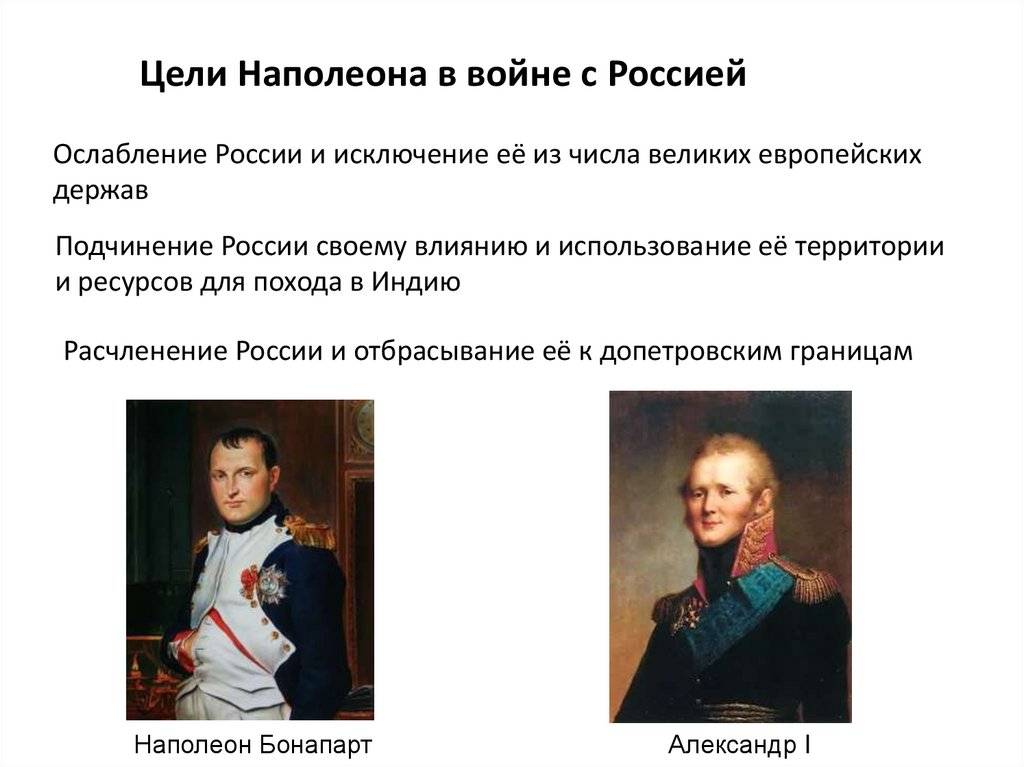 Цели Наполеона в войне с РоссиейОслабление России и исключение её из числа великих европейских