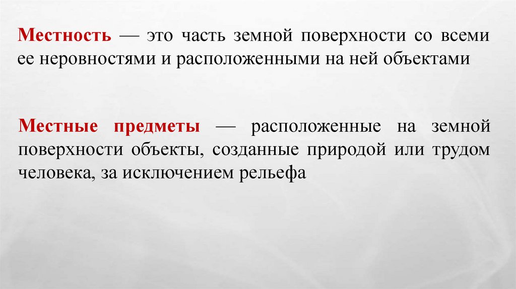 Местность — это часть земной поверхности со всемиее неровностями и расположенными на ней объектами