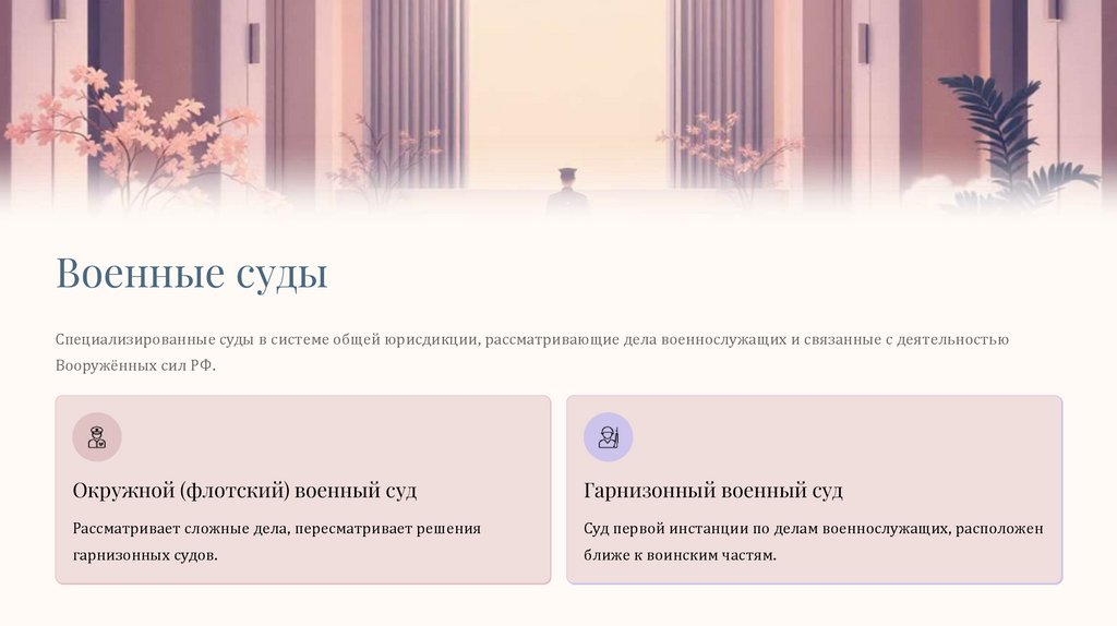 Военные судыСпециализированные суды в системе общей юрисдикции, рассматривающие дела военнослужащих и связанные с деятельностью