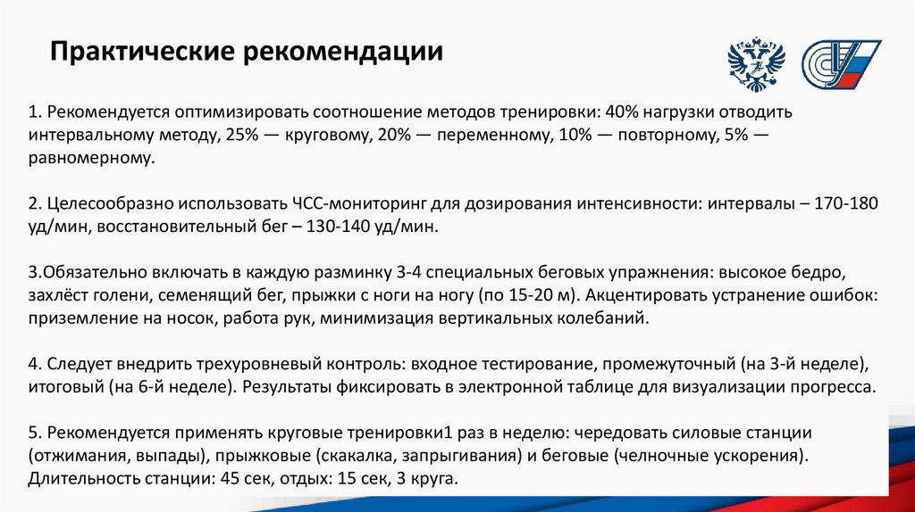 Практические рекомендации1. Рекомендуется оптимизировать соотношение методов тренировки: 40% нагрузки отводить